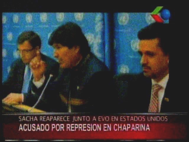El ex ministro de Gobierno reaparece en calidad de embajador de Bolivia ante la ONU junto al presidente Evo Morales cuando éste brindaba una conferencia de prensa a medios internacionales en la ciudad de Nueva York. (Gigavisión)