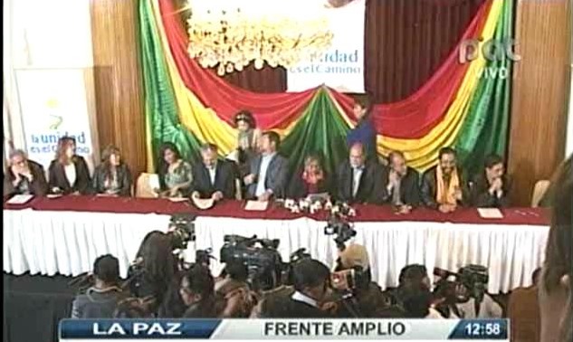 “Ya hemos firmado este acuerdo nosotros el 12 de agosto en Tarija, parte de Tarija ya es parte del frente amplio, ayer se lo ha hecho aquí en La Paz, en santa Cruz en horas de la tarde. Lo único que queremos pedirle a los compañeros del MAS es que no se pongan nerviosos, que este frente amplio es una institución política que pretendemos crear no contra el presidente Morales, no contra el MAS, sino una alternativa hacia el país. Para decirle al país esto propone el MAS en lo político, en lo económico, en lo social y esto proponemos nosotros como frente amplio en lo político, en lo económico, en lo social y ahora será el pueblo quien tenga que decidir el 2014 y el 2015. Lo que no vamos hacer es repetir lo que hemos hecho el 2006 y el 2009 de reunirnos o unirnos en el marco de la desesperación política y hacer algún proyecto político contra Evo Morales o contra el MAS, creo que ha sido la equivocación del siglo que hemos hecho nosotros en su momento. Se va conformar bajo la premisa de no volver al pasado, ni tampoco repetir el presente”. (Panamericana)