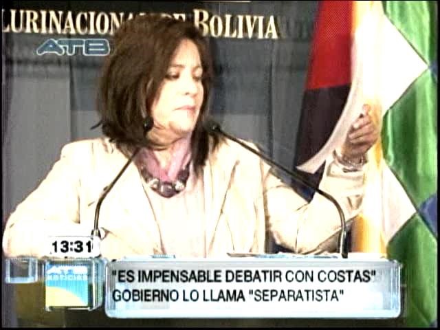 “Decirle que como gobierno el presidente Evo Morales no se va prestar a ningún debate con una persona que desde el 2003 anda en proyectos separatistas, (que) señala claramente advirtiendo y amenazando que no darse una refundación de Bolivia se duda de la permanencia de Santa Cruz en la actual estructura del país. Pero hay otra cosa más por la que es impensable un debate, es impensable un debate con alguien como el señor Rubén Costas y en esa época ya como gobierno departamental de Santa Cruz que puede llamar al presidente Evo Morales: excelentísimo asesino presidente de los bolivianos”. (ATB)