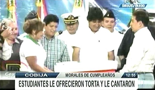 Cobija. Pando.- El presidente Evo Morales Ayma cumple mañana 54 años de vida, hoy en Pando durante el pago del bono Juancito Pinto los estudiantes adelantaron los festejos ofreciéndole una torta y también cantándole cumpleaños feliz.