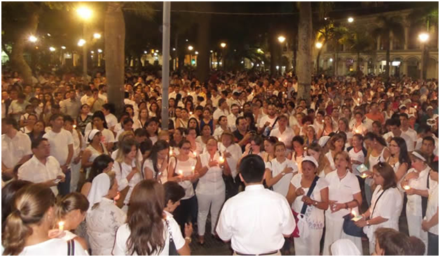 Antes del inicio de la marcha, se realizó una oración para “pedir la paz de todas las víctimas” que fallecieron por la inseguridad ciudadana. La mayor parte de la población iba vestida de blanco y encendieron velas para acompañar el rito religioso.