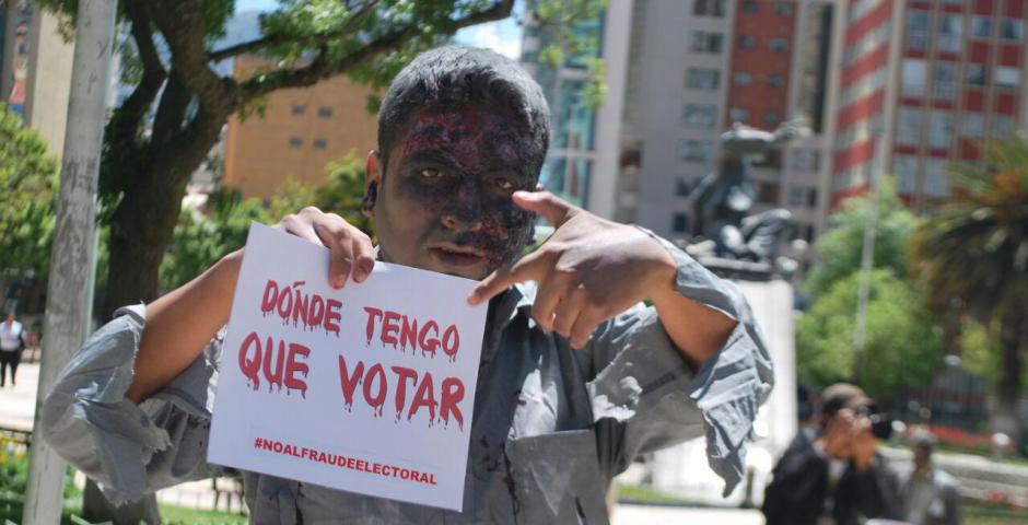 Jóvenes disfrazados como zombies –muertos vivientes– salieron esta mañana a las calles de La Paz para protestar contra las irregularidades al interior del padrón.“¿Dónde tengo que votar?”, decía uno de los letreros sujetados por uno de los zombies que salió a marchar esta mañana en la ciudad de La Paz. Junto con otros muchachos con atuendos similares, transitaron desde puertas del Tribunal Supremo Electoral (TSE) hasta El Prado.El Órgano Electoral informó en esta semana que “20 mil posibles muertos” no fueron depurados del padrón electoral por tener nombres homónimos en registros válidos.El Servicio General de Identificación Personal (SEGIP) reportó la existencia de 192 mil difuntos en listas, hasta 2011.Fuente: El Deber