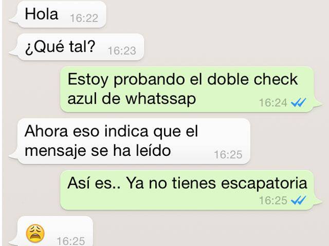 WhatsApp nos ha tenido dudando durante meses «doble check» significaba que el mensaje había sido recibido en el terminal o leído, pero ya solucionó el misterio: se trataba únicamente de una señal de que el mensaje había sido recibido en el terminal, lo que no implicaba lectura.Finalmente ahora el «doble check» de color azul, que indica que el mensaje ha sido leído. De nuevo, aquellos que gustan de recriminar la falta de respuesta tendrán un arma a su favor. Si el doble check es azul, el mensaje ha sido leído.Algunos usuarios han comenzado a verlo en algunas de sus comunicaciones, otros se están salvando del stress que pueden implicar que te lean y no te respondan!¿Te parece una buena o mala medida?FUENTE: RPP NOTICIAS