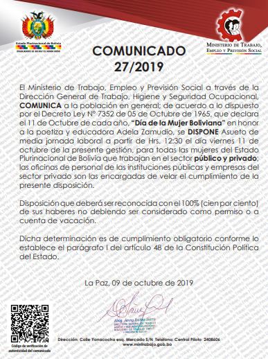 Ministerio de Trabajo, dispone asueto de media jornada laboral, este viernes 11 de octubre, para todas las mujeres que trabajan en el sector público y privado al conmemorarse el “Día de la Mujer Boliviana”.