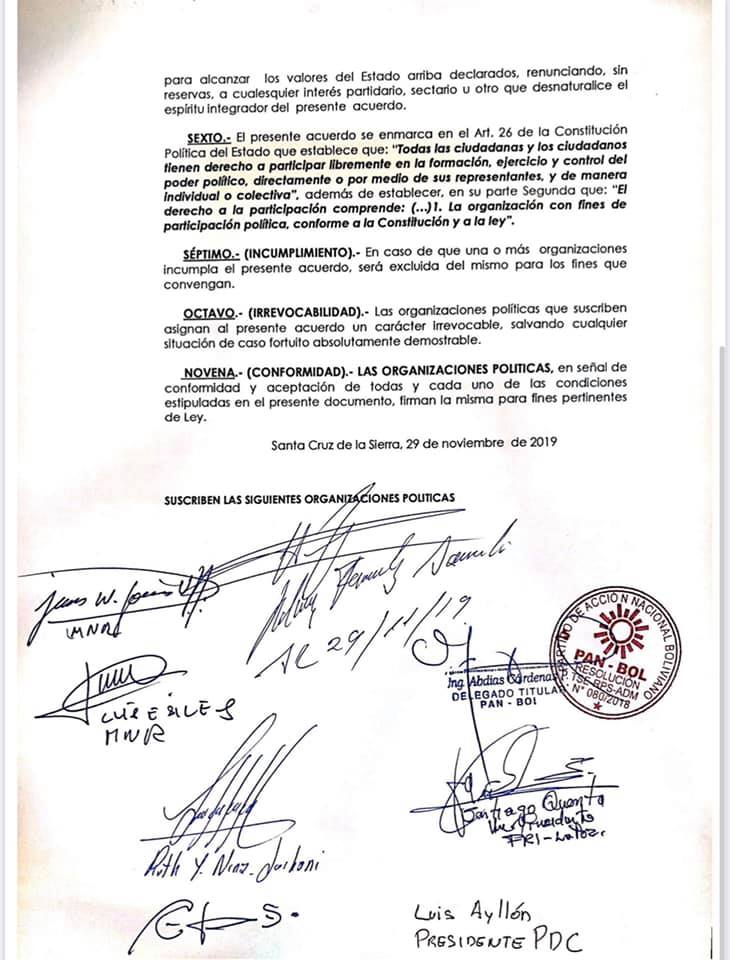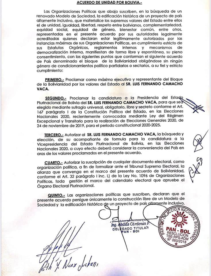 Aclaramos lo siguiente:1. Luis Fernando Camacho no es candidato del MNR.2. El MNR forma parte a la construcción de un bloque de unidad por el País.3 El objetivo es ser candidato del Bloque de unidad y no de un solo partido político.4. Este fin de semana se han cerrado alianzas con el PDC, PAN BOL, UCS, MNR y con los delegados departamentales del FRIEstamos construyendo la unidad que queríamos los bolivianos!Con fe, esperanza y la voluntad de Dios, será una realidad!https://www.eldeber.com.bo/158387_el-mnr-y-camacho-firman-u…JoseLuis Camacho ParadaLuis Fernando Camacho ParadaLuis Eduardo Serrate CespedesMaria Fernanda Camacho ParadaGabriela Antelo MJavier Camacho MiserendinoDario Matheo Suarez DuranSofia Abella AnteloLuciana AbellaRuben Antelo CanedoRuben Antelo