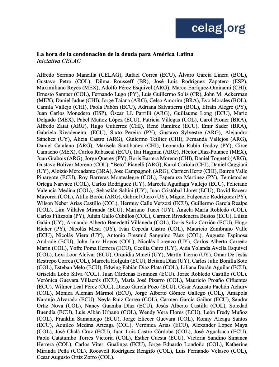 Nos sumamos a la iniciativa de @CELAGeopolitica que inició una campaña de recolección de firmas para que el FMI y otros organismos multilaterales condonen la deuda externa de América Latina. Llamamos a la unidad de la #PatriaGrande en torno a esta justa causa.#PrimeroLaVida https://t.co/aexXSSBtYj