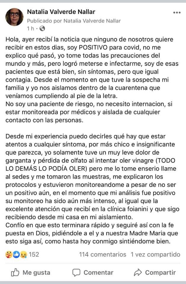 Con un post en sus redes sociales, Natalia Valverde, la hija del periodista Carlos Valverde, dio a conocer de manera pública que dio positivo a coronavirus.