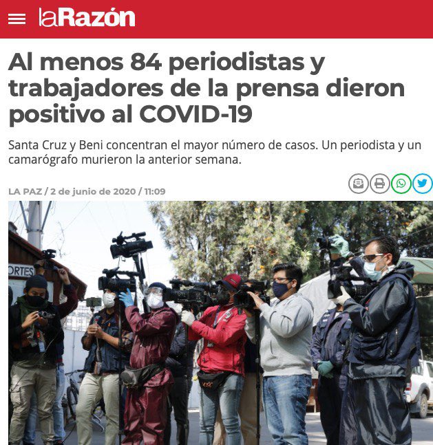 84 periodistas contagiados y 3 fallecidos por el coronavirus en Bolivia. Mi solidaridad con ellos y sus familias, y mi pedido a mis colegas, a los medios y las entidades que generan información para que se extremen las medidas de protección en la cobertura y la gestión de prensa. https://t.co/UQ7SHetPTO