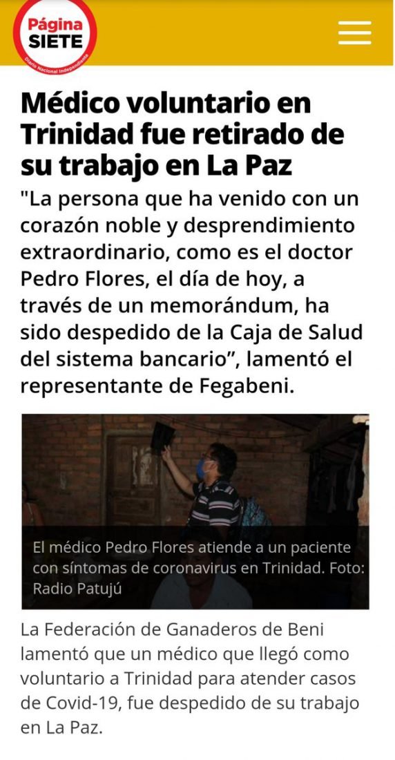 ¡Insensibles! El médico Pedro Flores fue de voluntario a ayudar en Trinidad y la Caja de Salud del Sistema Bancario lo retiró de su trabajo. ¿Cuál es la calidad humana de esa gente? ¡Hay que ser miserables, para pagar así a un doctor que fue a salvar vidas en el Beni! https://t.co/6jrOpxyAih