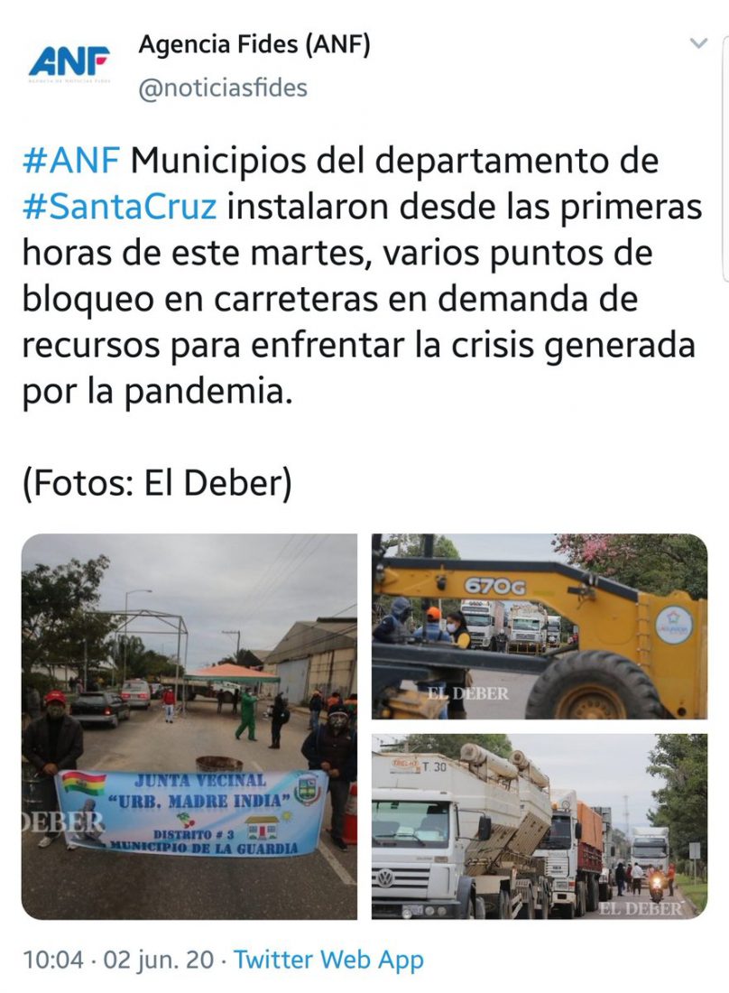 Municipios de SCZ sin recursos para luchar contra el Covid 19. ¿Dónde quedó el pacto fiscal del que hablaba desde la gobernación el Mtro. Parada? ¿Dónde están los recursos prometidos a los municipios? El centralismo heredado del MAS sigue siendo el mal que más aqueja a este país https://t.co/3kTOFdCTXI