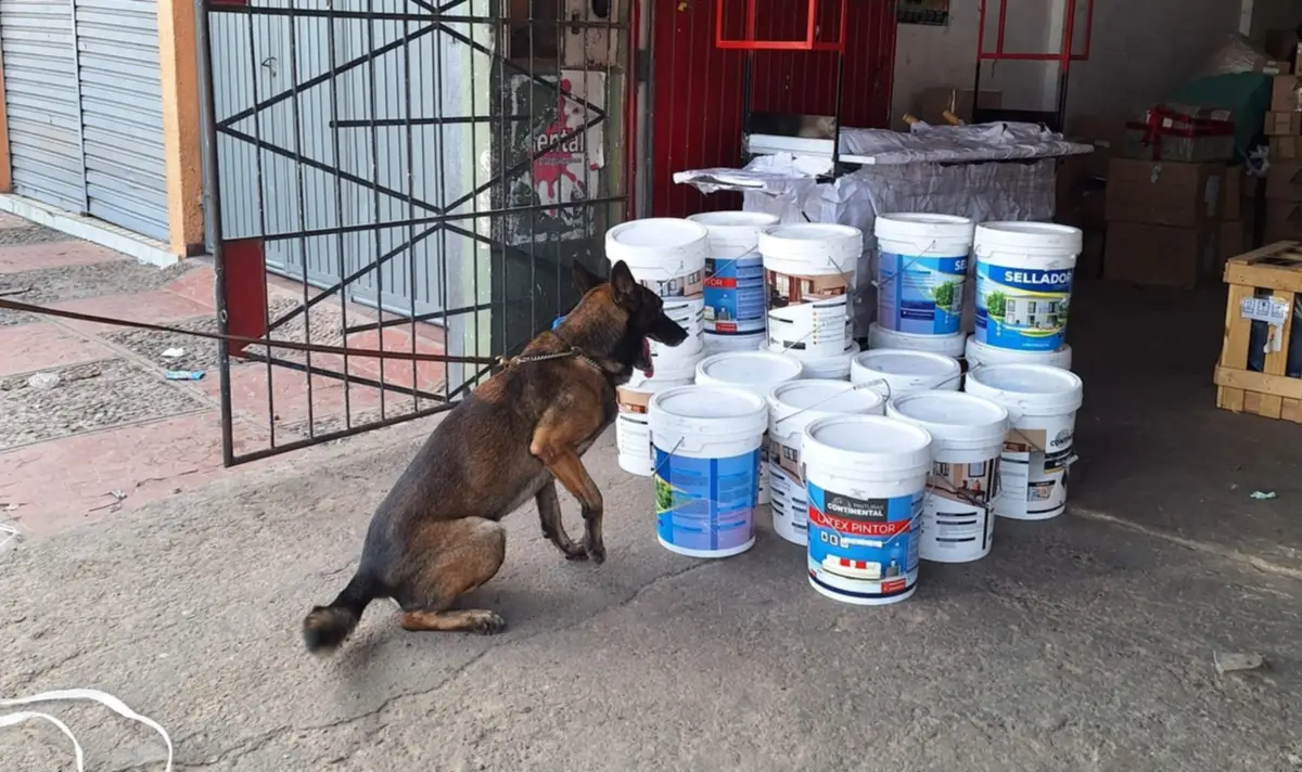 El can «Xaman» alertó a los agentes sobre un olor extraño proveniente de varios baldes de pintura, que habían llegado desde la ciudad de Sucre.