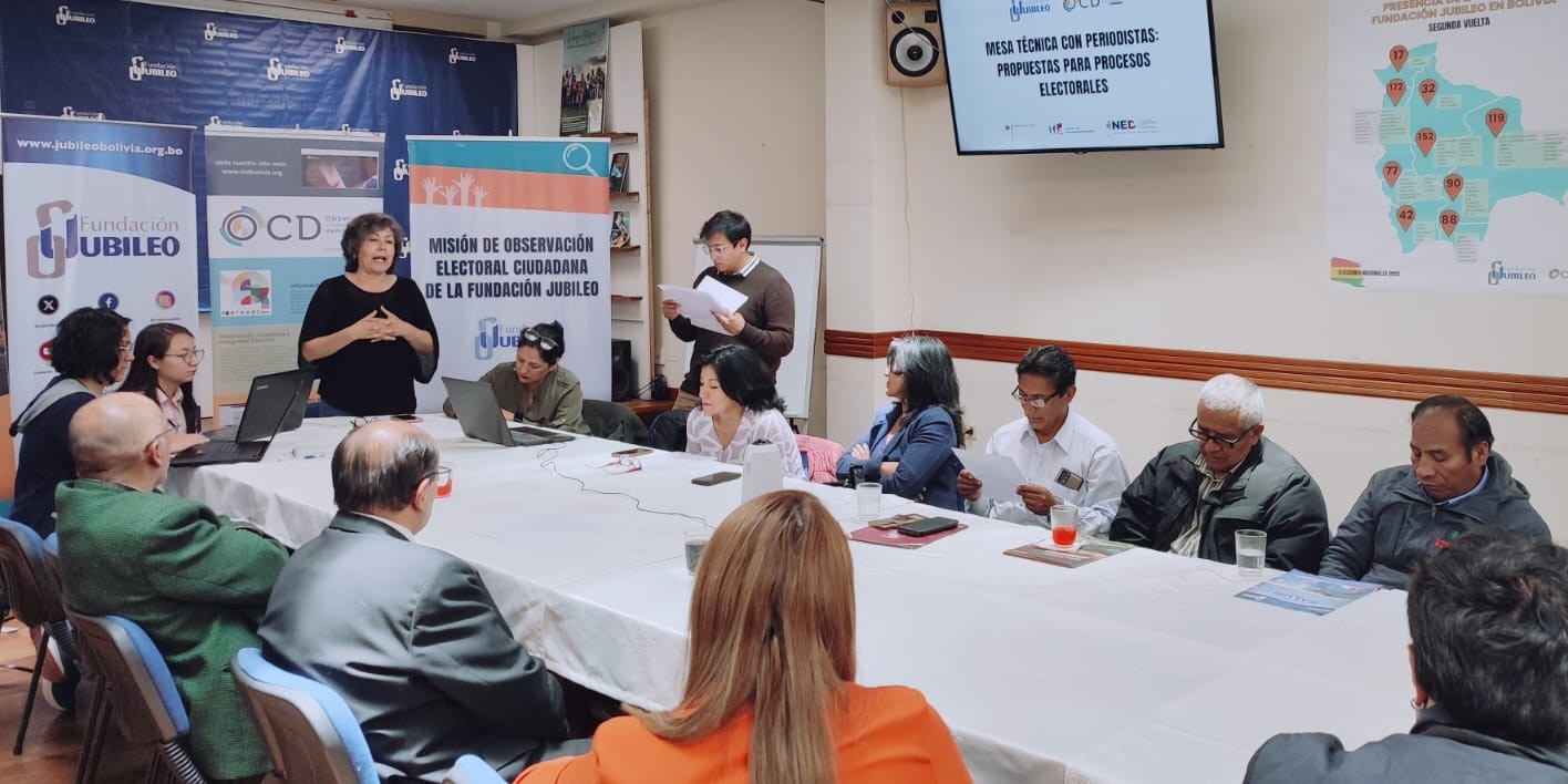 El equipo de la Misión de Observación Electoral de Jubileo desarrolla un proceso de diálogo y levantamiento de insumos con periodistas de distintos departamentos de Bolivia para elaborar propuestas que mejoren las condiciones de participación y cobertura periodística en procesos electorales.