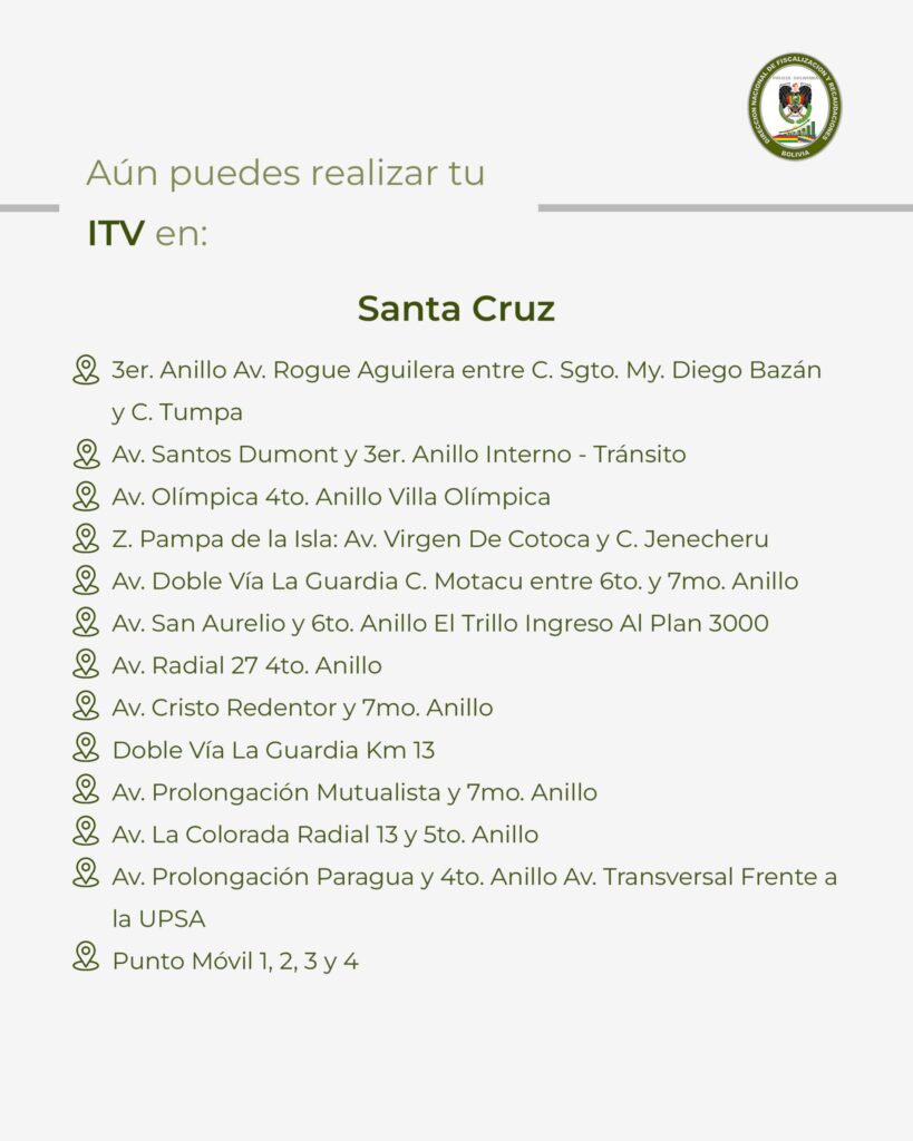 «La Dirección Nacional de Fiscalización y Recaudaciones informa a la ciudadanía que, concluido el plazo oficial de la Inspección Técnica Vehicular 2025, se han habilitado de manera excepcional algunos puntos de atención para las y los propietarios de vehículos que no realizaron la ITV dentro del período establecido», se lee en una publicación de esa repartición.