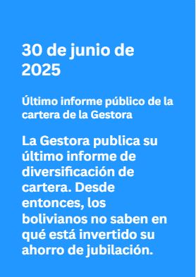 La última actualización pública del informe de diversificación de cartera de la Gestora data del 30 de junio de 2025. Desde entonces, la entidad no ha publicado una actualización. Ni la ASFI —cuyo director proviene, como se señaló, del sector privado regulado— ni el Ministerio de Economía le han exigido que lo haga, según allegados consultados.