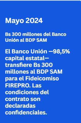 En mayo de 2024, el Banco Unión —con participación estatal de 98,5%— transfirió 300 millones de bolivianos al BDP SAM para el Fideicomiso FIREPRO. Este medio solicitó al BDP SAM los resultados del fideicomiso, las áreas de la economía beneficiadas y una copia del contrato.