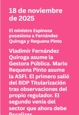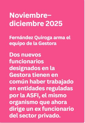 El BDP ST —BDP Sociedad de Titularización, hermana del BDP SAM con mayoría estatal y Paz Bernardini en su directorio— es la entidad de la que salió Fernández Quiroga en 2021 tras las observaciones de la ASFI. Hoy Fernández Quiroga dirige la Gestora Pública, que a su vez es supervisada por la APS en coordinación con la ASFI, cuyo director llegó del sector privado regulado.