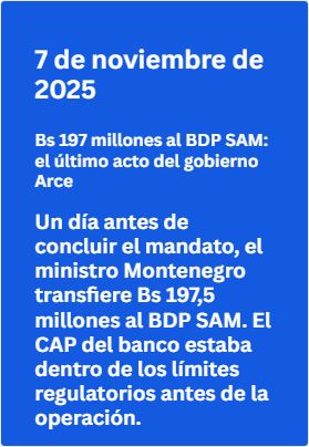 Consultado por este medio sobre la razón del desembolso de 197 millones de bolivianos en la víspera del fin del mandato presidencial, el BDP SAM respondió que los aportes de capital son un “mecanismo común” para mantener el Coeficiente de Adecuación Patrimonial (CAP) dentro de los rangos regulatorios, y que la capitalización estaba prevista en la planificación estratégica 2022–2024.