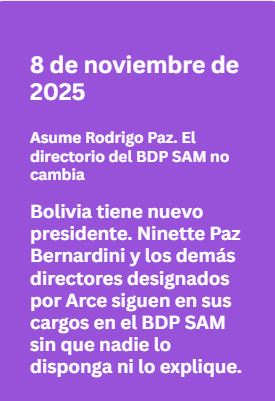 Ninette Denisse Paz Bernardini no solo preside el directorio del BDP SAM. Su nombre aparece también en el directorio de BDP Sociedad de Titularización, entidad de la que Fernández Quiroga fue gerente hasta que la ASFI formuló sus observaciones. Se trataría, en términos de gobernanza corporativa, de una red de cargos en entidades del Estado que comparten directores, gerentes y vínculos con el gobierno anterior, que permanece intacta bajo la nueva administración.