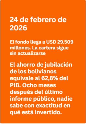El fondo de pensiones es el mayor cúmulo de riqueza colectiva constituido en la historia económica de Bolivia. Equivale al 62,8% del PIB boliviano de 2024, y al 69,7% del PGE consolidado de 2025. Es 14,9 veces las Reservas Internacionales Netas de octubre de 2025, y más de 2 veces la deuda externa de Bolivia. Desde hace ocho meses, nadie fuera del sistema sabe con exactitud en qué está invertido.