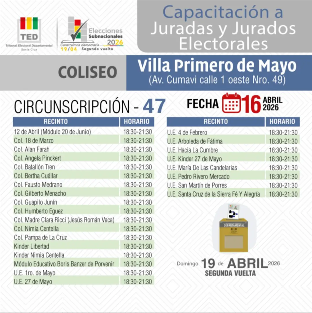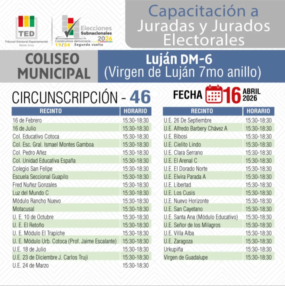 El presidente del TED Santa Cruz, Marco Monasterio, destacó la importancia de la asistencia y detalló la red de puntos disponibles para los jurados sorteados. “Los centros de capacitación permanentes están dispuestos en el Colegio de Contadores de la calle 24 de septiembre, en el coliseo Santa Rosita, en el de la Villa Primero de Mayo, en el coliseo Municipal de Cotoca, en la Casa de la Cultura de La Guardia y en la Casa de la Cultura de Montero”, precisó la autoridad.