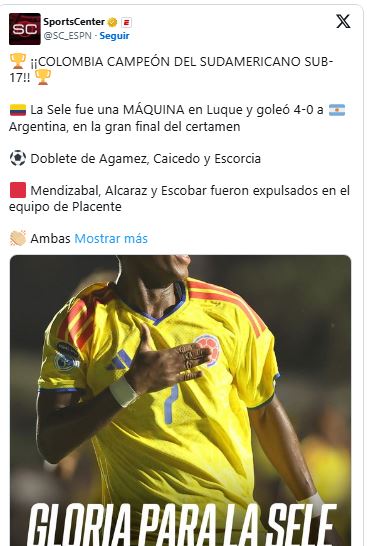 Colombia le ganó 4-0 a Argentina en la final y se consagró campeón del Sudamericano Sub 17 disputado en Paraguay. Los goles fueron de Agamez (x2), Caicedo y Escorcia.