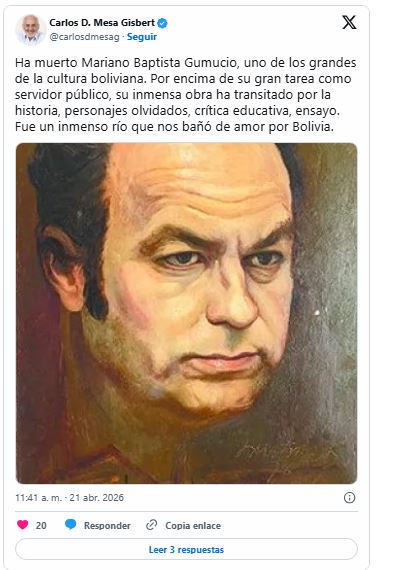 El reconocido intelectual boliviano Mariano Baptista Gumucio falleció este 21 de abril a los 93 años, según informó en redes el expresidente del Estado, Carlos Mesa.