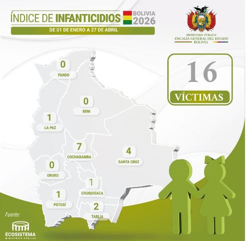 “El día de hoy estamos siendo informados de un nuevo hecho de Infanticidio que habría ocurrido en Cochabamba, a la fecha, hay 16 víctimas en todo el país, de las cuales 7 corresponden a ese departamento. Se activó la ruta de actuación interinstitucional entre las unidades de la Policía Boliviana, la Fiscalía y el Órgano Judicial para el inicio de las investigaciones correspondientes, a fin de esclarecer las circunstancias de este hecho”, señaló Mariaca.