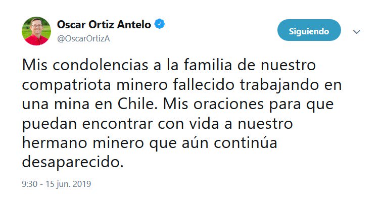#ANF El candidato presidencial por @BoliviaDiceNo_, @OscarOrtizA, expresó sus condolencias a la familia del minero fallecido tras quedarse atrapado en la mina San José de Tocopilla. El senador espera que se pueda encontrar con vida al otro trabajador minero que está desaparecido. https://t.co/jeJ8XVpQ7F
